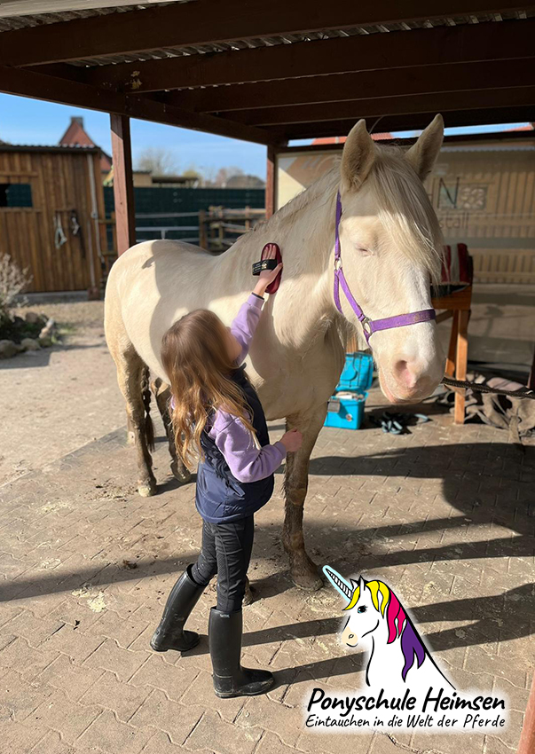 🐴 In den 60 Minuten beginnen wir mit Theorieunterricht und putzen gemeinsam. Zusammen rüsten wir das Pferd zum Reiten aus und gehen auf den Reitplatz zum